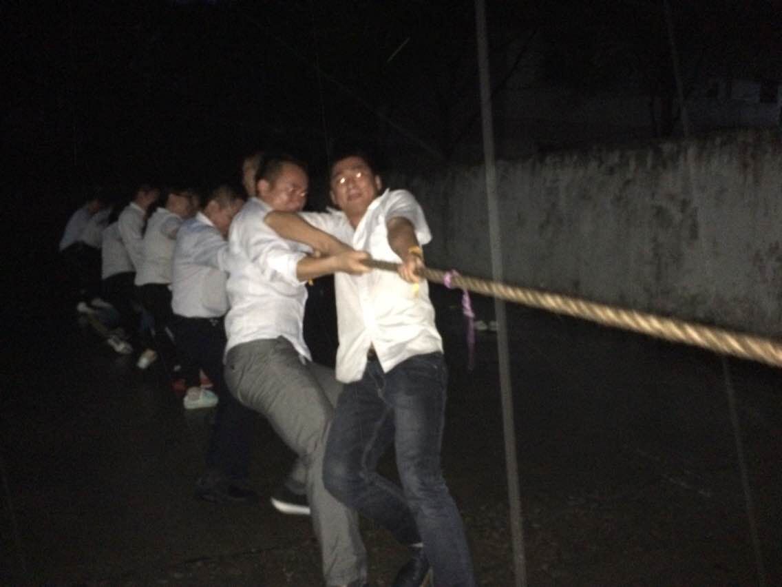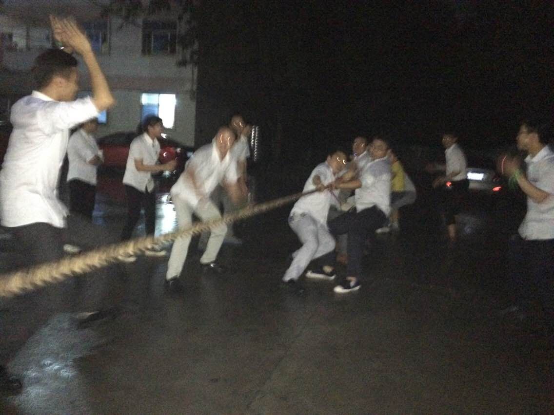 2015年4月7日公司舉行拔河比賽,上午還晴空萬(wàn)里的天氣,下午卻天公不作美和之前風(fēng)和日麗的景致截然相反突然下起了大雨,所有一直焦急的等待著雨停,一直到下午6.30分,雖然仍是陰雨飄落,且溫度降低且天已經(jīng)黑了,在經(jīng)過(guò)各隊(duì)長(zhǎng)的商量后一致決定冒雨拔河。