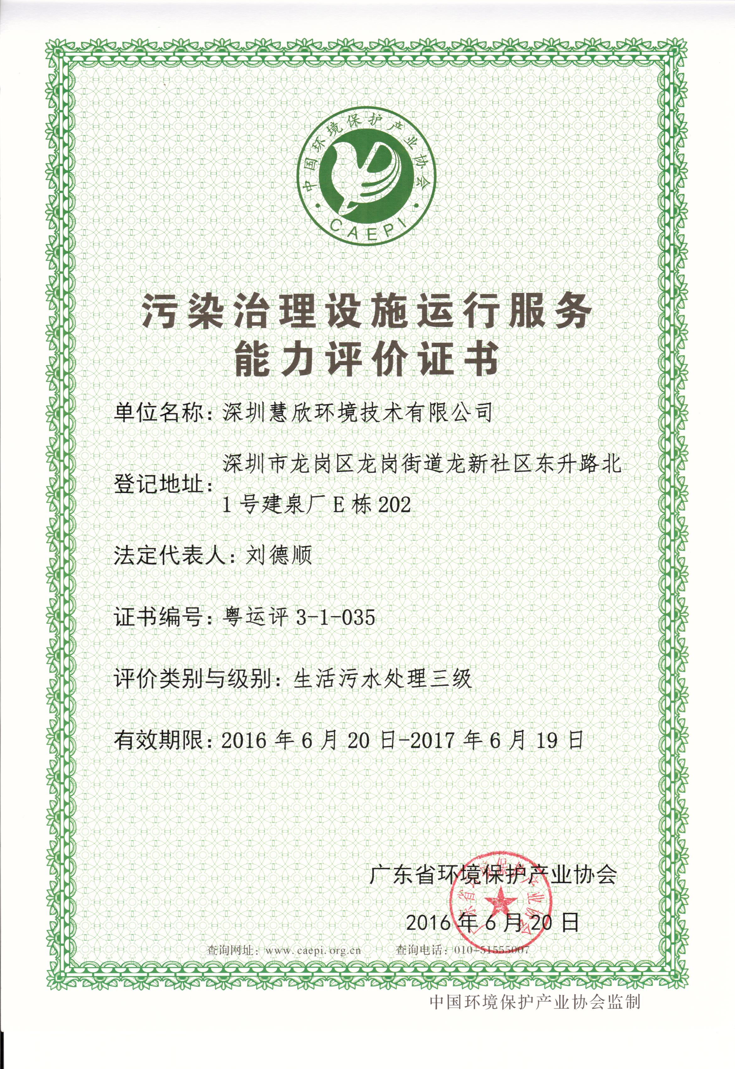 經廣東省污染治理設施運行服務能力評價委員會會議審定及公示無異議后,批準35家單位為2016年第一批廣東省污染治理設施運行服務能力評價證書獲證單位,我公司子公司慧欣環境名列其中,獲得生活污水三級、工業廢水三級證書。