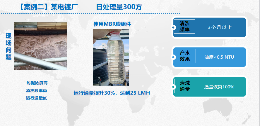 6. 高抗污染性能:在40LMH運行通量下,膜組件清洗周期長達3個月以上。
